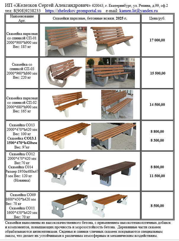 Выбираем уличные скамейки! Скамейки парковые на бетонных ножках. Уличные скамейки, садовые, парковые и дворовые скамейки — это неотъемлемый элемент дизайна городской, дворовой территории, парка или дачного участка. Качественные и красивые уличные скамейки выгодно дополнят любой ландшафт. Парковые и садовые скамейки, места для отдыха хватит всем. Скамейки на бетонных ножках. Уличная мебель. Садовая мебель. Парковые городские скамейки по доступным ценам со спинками и без спинок. Ножки скамеек выполнены из высококачественного бетона, с применением высокотехнологичных добавок и компонентов, повышающих прочность и морозостойкость бетона. Скамейка со спинкой СП03. Размер: 2000*960*h860 мм. Вес: 220 кг 15600,00 Бетонные изделия на скамейках выполнены из высококачественного бетона, с применением высокотехнологичных добавок и компонентов, повышающих прочность и морозостойкость бетона. Деревянные части скамеек обрабатываются антисептиками. Сиденья и спинки скамеек покрываются специальным лаком, что делает их устойчивыми к различным атмосферным и механическим воздействиям.