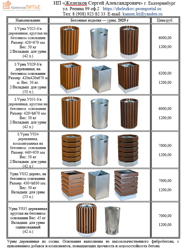 Урна деревянная, круглая У023 на бетонном основании Размер: 420*h670 мм. Вес: 40 кг. Цена: 6000,00+ 1200,00 вкладыш. Сумма 7200,00